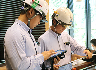 後輩と共に現場巡視を行います。図面を見てちゃんとできているか?作業員さんは危険な作業はしていないか?一緒にまわって“現場を見る目”を育てます。